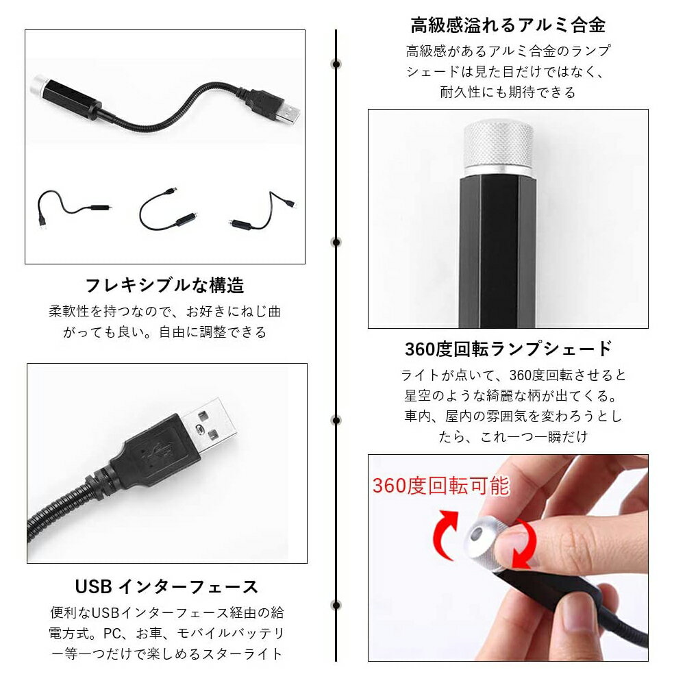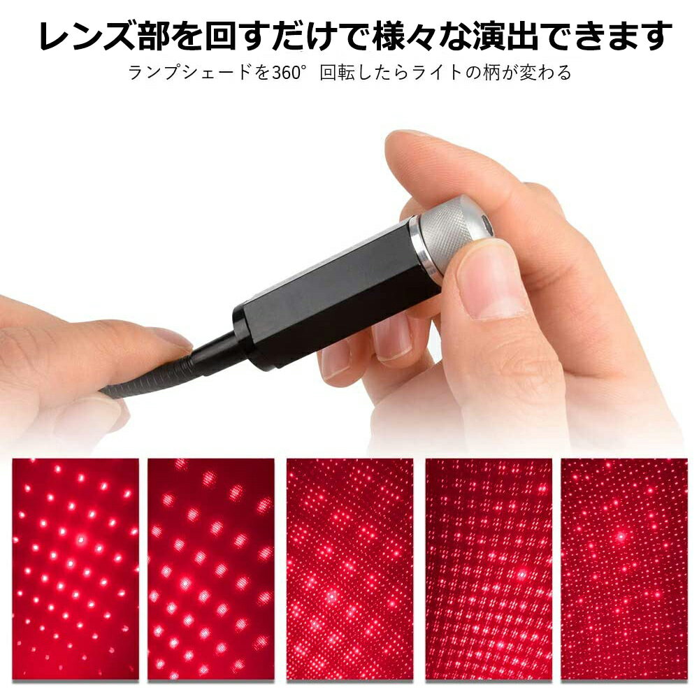 車用イルミネーション 星空投射ランプ 車載 雰囲気ライト USB給電 車内アクセサリー 取付簡単 高輝度 発光モード変更 投射ランプ レッド発光 1本売り
